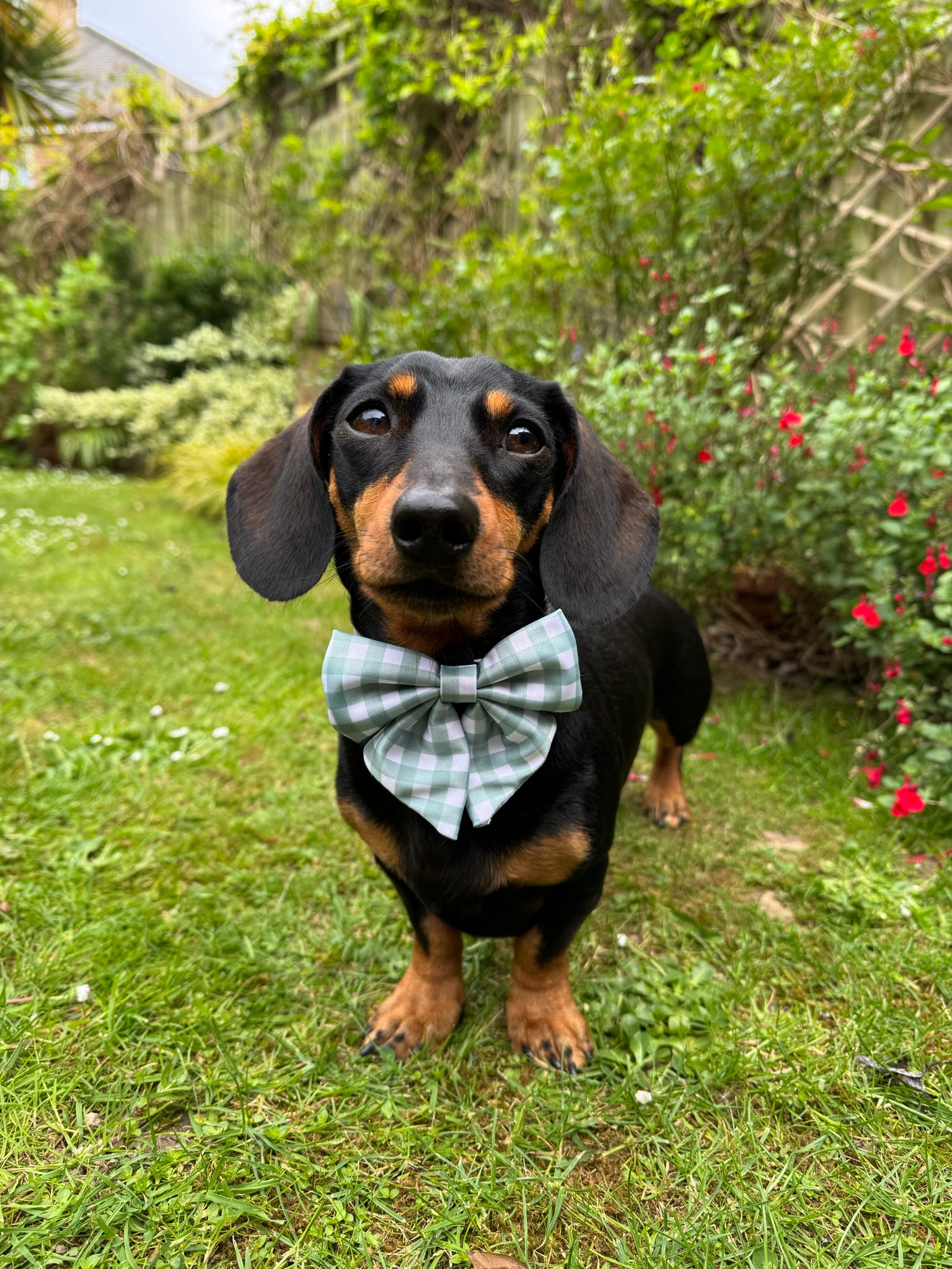 Introducing the Matcha Milkshake Sailor Bow - the must-have accessory for any pup! This quirky bow features a playful sage green and white gingham design, perfect for making a stylish statement. The velcro strap makes it easy to put on and take off, so your dog can sail away in style!