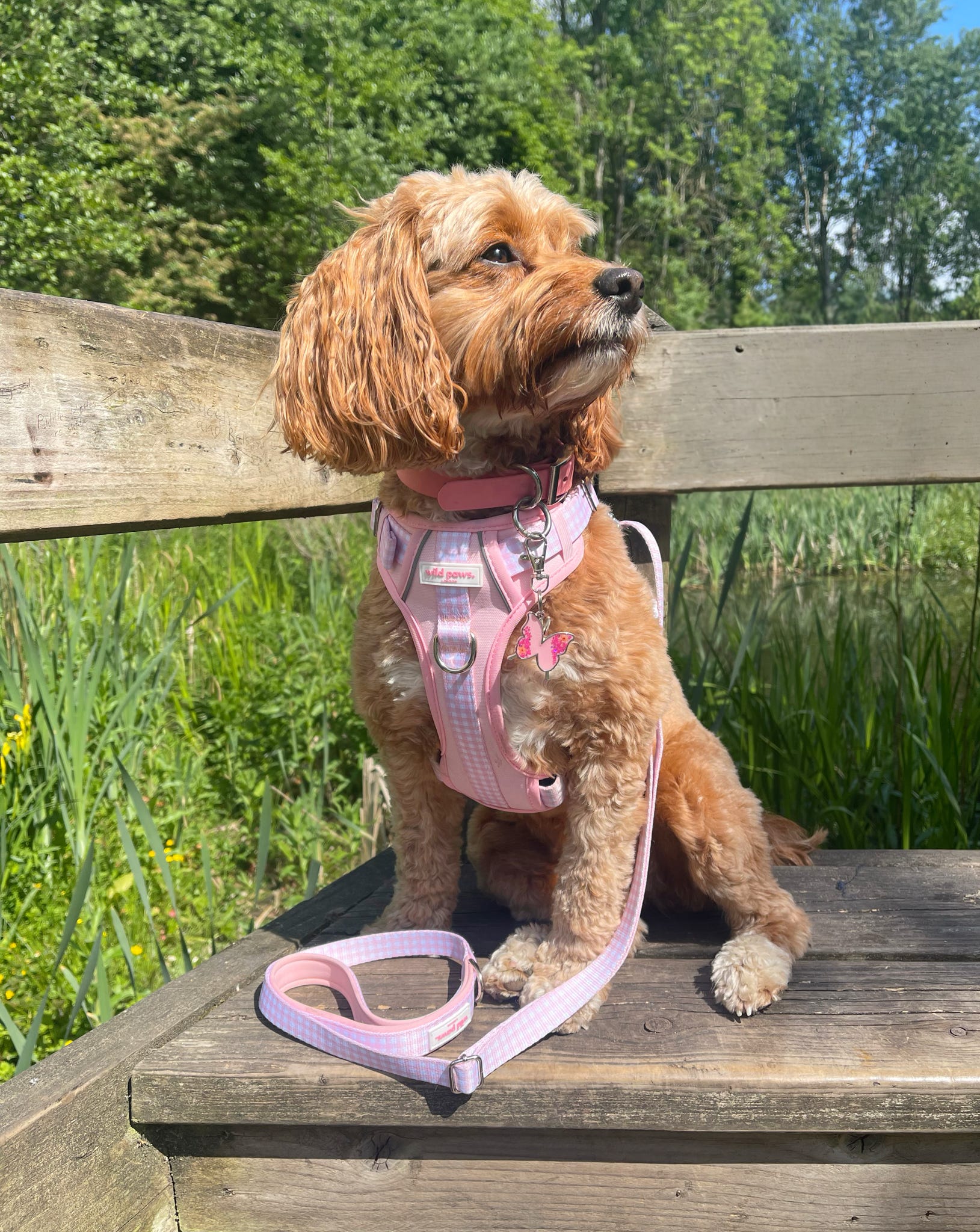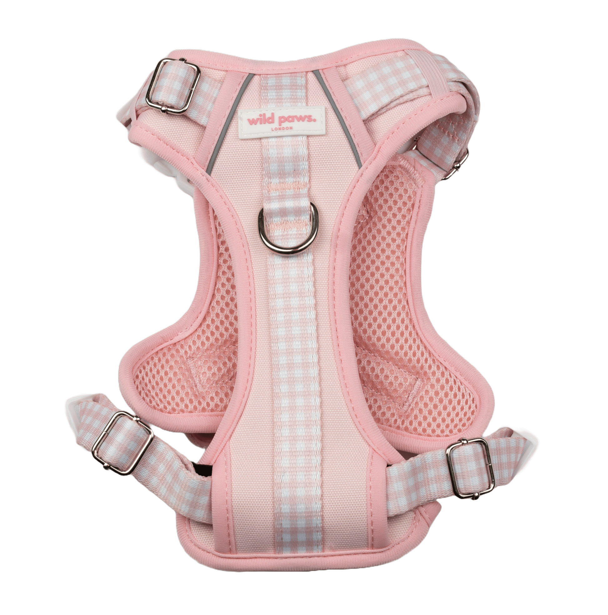 Sweet style, strong design. The Strawberry Shortcake Wild Edition Harness features a soft pastel pink base with crisp white gingham accents down the chest, straps, and handle — perfect for pups who love to stand out.